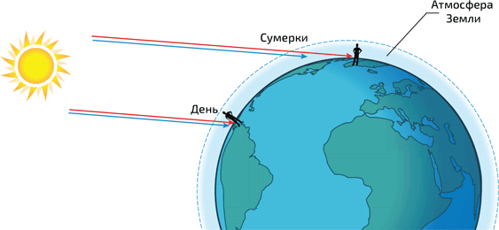 5. Испускаемое Солнцем излучение с большими длинами волн в красной части спектра рассеивается меньше, чем излучение с короткими длинами волн в синей части. Поэтому в сумерках падающий под малым углом синий луч сильно рассеивается в атмосфере и доходит до Земли приглушенным, в отличие от красного. Днем же все цвета солнечного излучения достигают земной поверхности. (Пропорции не соблюдены.)