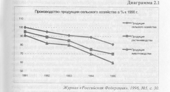 Валовая продукция сельского хозяйства в 1995 году – 276 трлн. руб. – уменьшилась по сравнению с предыдущим годом еще на 8% (в 1994 г. снизилась на 12%)