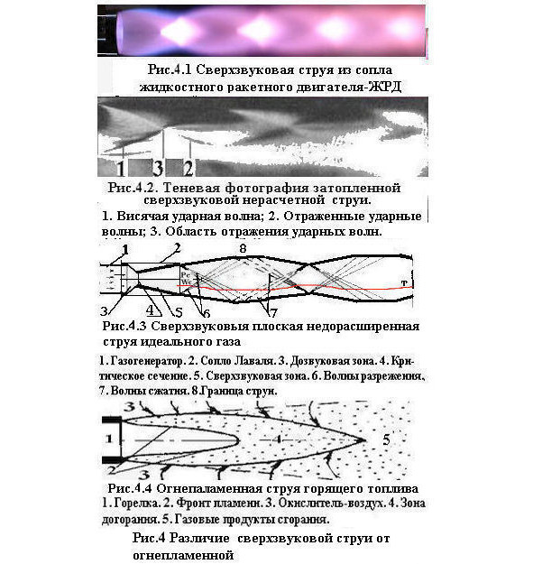 Сверхзвуковая струя, это сложный энергетический газовый поток неоднородных полей скорости, давления, температур с наличием сдвинутых слоев газодинамических характеристик сверхзвуковых и дозвуковых зона, рис.4. Её строение, даже визуально и на звук, в принципе отлично от огнепламенных струй.