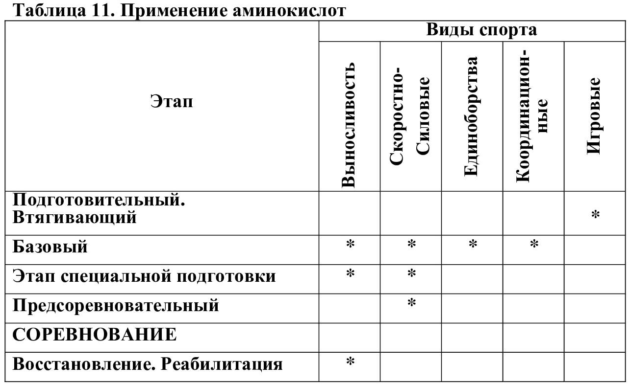 В скоростно-силовых видах спорта аминокислоты применяются в период «наработки» мышечной массы, когда востребованность белка и легкоусвояемых аминокислот особенно высока. В видах спорта на выносливость аминокислоты употребляются с той же целью, а так же с целью восстановления после длительных истощающих нагрузок во время тренировок и соревнований по кубковому варианту.
