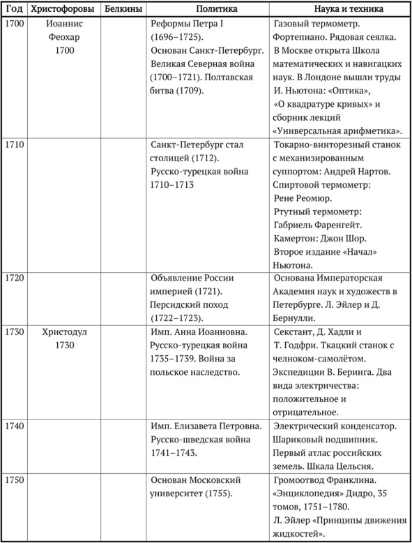 Синхронистическая таблица. XVIII век