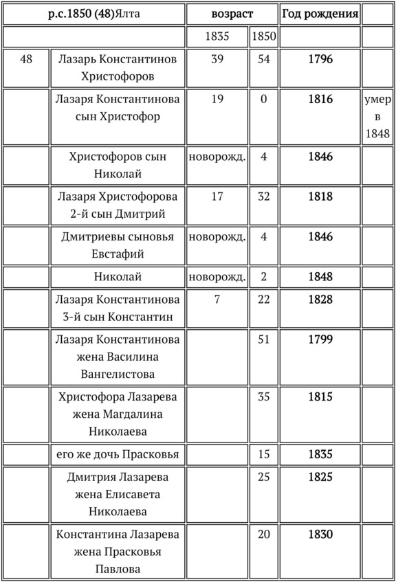 Первое, что мы отметим: Лазарю Константиновичу «подправили» возраст: в сказке 1811 года он рожден в 1794, а в сказке 1850 – в 1796 году. То ли просто ошиблись, то ли уточнили. У Лазаря Константиновича была жена Василина Вангелистова 1799 г.р. и трое детей: Христофор (1816 – 1848), Дмитрий (1818 г.р.) и Константин (1828 г.р.)