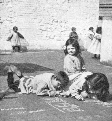 Ребёнок посмотрел на меня, улыбнулся, потом остановился на минутку, точно для того, чтобы разразиться каким-то радостным движением, и вдруг закричал: «Пишу! Я пишу!» Затем он бросился на пол и написал на нём «mano» (рука), потом в восторге написал ещё «camino» (труба), потом «tetto» (крыша). Пока он писал, он не переставал громко кричать: «Пишу! Умею писать!» На его крики сбежались другие ребятишки, окружили его кольцом, и все смотрели на него с любопытством. Двое или трое, дрожа от волнения, закричали мне: «Мела! И я буду писать!» И, действительно, начали писать разные слова»… Дальше Монтессори подробно пишет о волнении и счастье, охвативших детей, когда они выучились писать. Она говорит, что дети сочли это за дар природы, как умение говорить и ходить, который приходит всякому человеку естественно, и который они не сумели, разумеется, приписать тем подготовительным упражнениям, которые они делали в её школе, так как они не умели видеть между ними никакой связи. – «В первые дни», – говорит она, – «мы были объяты таким восторгом, – точно мы во сне или точно мы присутствуем при каких-нибудь чудесных явлениях» (картина № 12).
