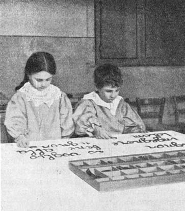 «Как только ребёнок познакомится с несколькими гласными и согласными», – пишет Монтессори, – «мы кладём перед ним большой ящик, заключающий в себе все гласные и согласные, которые он заучил вместе с неизвестными ещё ему буквами. Учительница отчётливо произносит какое-нибудь слово, очень ясно произнося в нём звуки и повторяя их по несколько раз. Ребёнок почти всегда импульсивным движением хватает нужную букву и кладёт её на стол. Учительница повторяет слово. Ребёнок хватает следующую букву и кладёт её рядом с предыдущей. Второй слог он уже составляет без всякого затруднения… Для упражнения можно взять любое слово, лишь бы только ребёнок хорошо в отдельности слышал буквы, из которых оно состоит. Он его составляет, кладя один за другим значки, соответствующие произносимым звукам. Чрезвычайно интересно наблюдать ребёнка за этой работой. С напряжённым вниманием он смотрит на коробку, чуть заметно шевеля губами и вынимая одну за другой нужные буквы… Движения губ вызваны тем, что он много раз повторяет про себя слова, звуки которых переводит в значки».