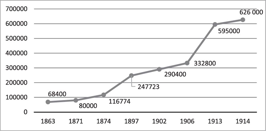 Рис. 1. Зростання населення Києва (з передмістями), 1863–1914 рр.