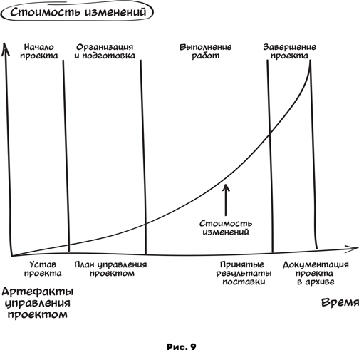Со стоимостью внесения изменений в проект все наоборот. На начальном этапе изменения можно вносить как угодно, и это будет бесплатно или недорого. Но чем дальше будет продвигаться проект, тем дороже будет стоить внесение изменений (рис. 9).