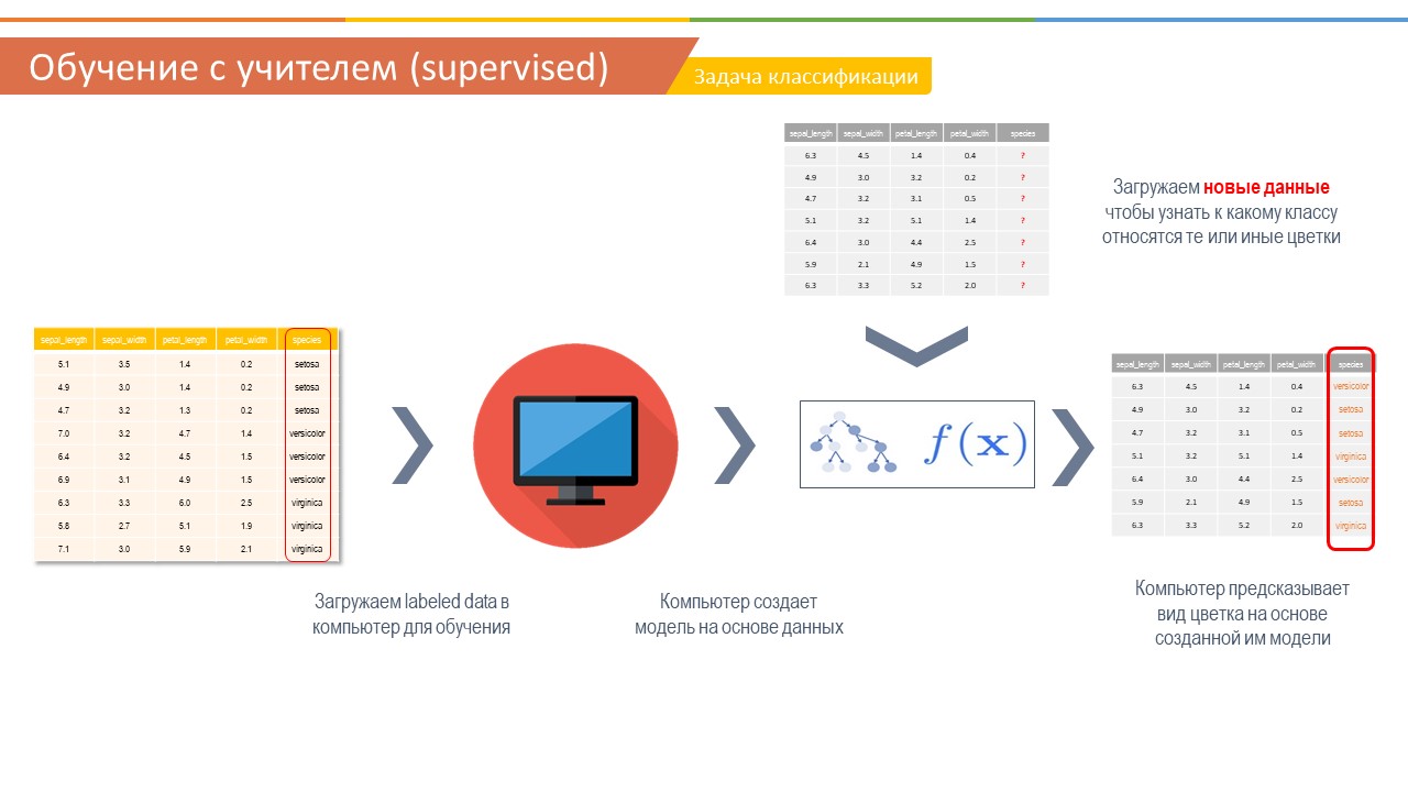 Почему этот пример можно считать обучение с учителем? Потому что наши данные распределены по признакам, у каждого признака есть показатель для конкретного цветка, то есть размеры длины и ширины. И имеются ответы или метки, какой вид ириса бывает при тех или иных размерах лепестка и чашелистника. То есть мы как учитель обучаем нашу модель и говорим ей, что вот окей, если ты видишь, что размер лепестка такой-то, а чашелистника – такой, то этой ирис виргинский, а если размеры такие-то и такие-то, то это ирис разноцветный. Это и называется обучение с учителем, когда мы показываем нашей модели все ответы в зависимости от признаков. Модель учится на этих данных, и создает формулу или алгоритм, который поможет нам в будущем предсказывать вид цветка в зависимости от размеров, когда нам будут поступать новые образцы цветов.