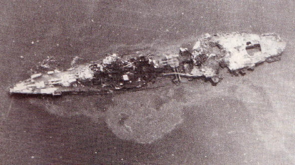 Pewne wyobrażenie o tym, co dzieje się na pokładzie Yamato, daje fotografia tego samego typu pancernika Hyugu, po bombardowaniu w sierpniu 1945 r., Holowanego na płytkiej wodzie.
