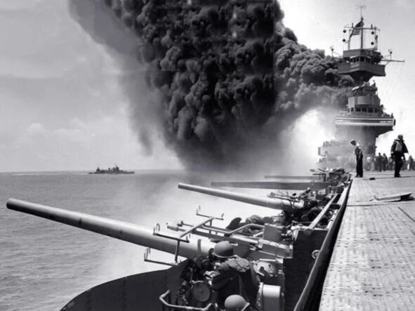 Spragnione zemsty zespoły Enterprise i Hornet przygotowują grupę samolotów do ataku. Amerykanie nie mają już bombowców torpedowych, ale jest 41 bombowców nurkujących. Aby odeprzeć atak, «Hiryu» ma tylko 6 myśliwców «Zero», które zostały uruchomione. Amerykanie tracą trzy samoloty, ale otrzymują cztery trafienia 450-kilogramowymi bombami. Zespoły zapewniające przetrwanie ulegają licznym pożarom w ładowniach. Rankiem 5 czerwca japońskie dowództwo wydało rozkaz zatopienia bohaterskiego Hiryu. W bitwie nie biorą udziału japońskie lekkie lotniskowce, artyleria i transportowce. Główna grupa rekolekcji japońskich. Samoloty amerykańskie w miarę możliwości w warunkach pogarszającej się pogody uszkadzają go. Straty stron. Japonia 4 lotniskowce, ciężki krążownik, 250 samolotów morskich, 2500 pracowników. USA ciężki lotniskowiec, niszczyciel, 150 samolotów, 350 osób nieodwołalnie. Zdjęcie lotniskowiec «Hiryu» po atakach amerykańskich samolotów, wieczorem 4 czerwca 1942 r
