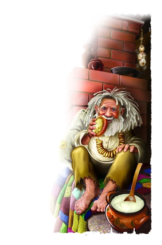 Под столом послышались возня и старческое покашливание. Через минуту из-под него вылез босой старик в широких штанах и рубахе сероватого цвета. Его седая борода и волосы были заплетены в мелкие косички. Следом за ним, кряхтя, вытащил своё рослое тело Леший и тут же уселся за стол. Домовой садиться не стал – схватив с блюда ватрушку и засунув её себе в рот, он ловко вскарабкался на печку и, усевшись, свесил вниз свои босые ноги, покрытые мягким пушком. Громко чавкая, он принялся раскачиваться из стороны в сторону.