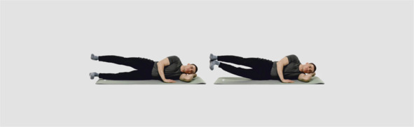 Исходное положение – лежа на левом боку, левую руку удобно положили под голову, правой рукой упор на пол перед грудью, ноги прямые. На раз приподнимаем не высоко над полом правую ногу, на два приставили левую ногу, на три опустили левую ногу, на четыре опустили правую ногу. То же на правом боку. Дыхание произвольное. Темп средний. Выполнить 4 раза.