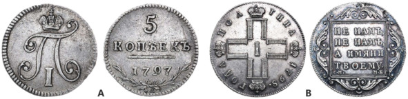 Рис. 1 – Пример вензелей на монетах Павла I. А – вензель, состоящий из буквы «П» и цифры «I»; B – монограмма, составленная из четырёх букв «П» и цифры «I» в центре