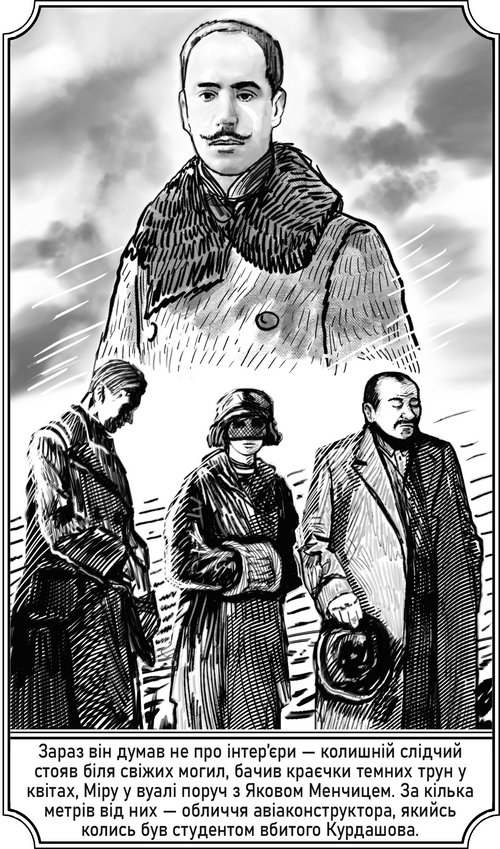 Зараз він думав не про інтер’єри – колишній слідчий стояв біля свіжих могил, бачив краєчки темних трун у квітах, Міру у вуалі поруч з Яковом Менчицем. За кілька метрів від них – обличчя авіаконструктора, який колись був студентом вбитого Курдашова. Рівний ніс, насуплені густі брови, маленький прямокутник вусів. Зовсім молодий, певно, ровесник Якова Менчиця. Запитати б у нього…