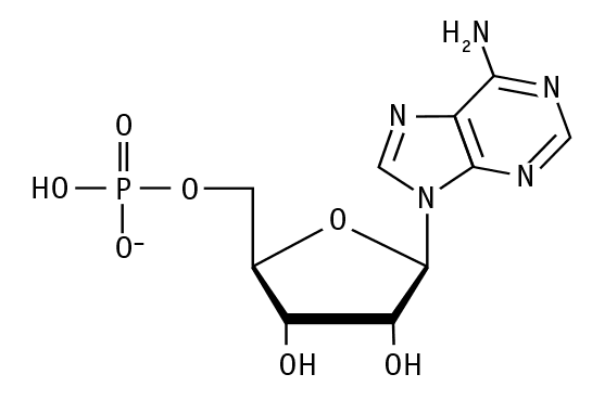 Энергия высвобождается при гидролизе[8] АТФ, когда от молекулы последовательно отщепляются остатки фосфорной кислоты (на формуле они видны слева). При отщеплении концевого остатка фосфорной кислоты АТФ переходит в аденозиндифосфорную кислоту (АДФ), при отщеплении второго остатка фосфорной кислоты – в аденозинмонофосфорную кислоту (АМФ).[9]