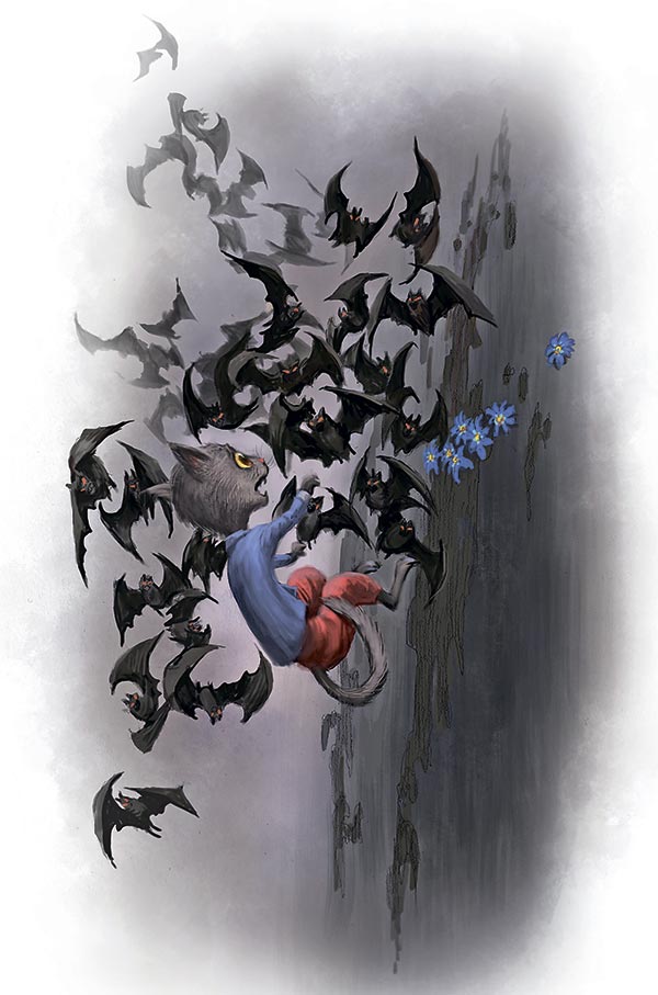 Тимми снова открыл глаза и огляделся вокруг, но увидел лишь машущие серо-чёрные крылья, дикие глаза и разинутые пасти. Воздух буквально кипел от летучих мышей. Его лапки соскользнули с каменного уступа, и он рухнул вниз.
