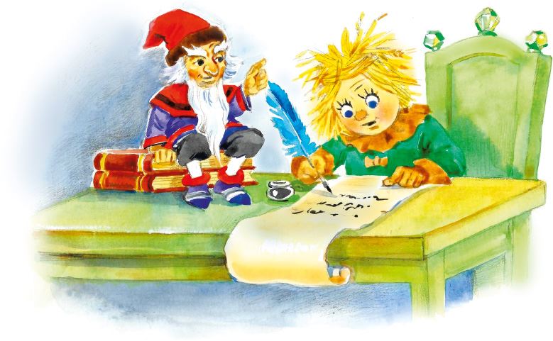 Тогда-то Страшила и решил взяться за грамоту всерьёз. В кладовке, среди вещей, оставшихся от волшебника Гудвина, он разыскал стопку бумаги и большое перо лазурного цвета. Затем призвал на подмогу старейшину гномов Кастальо – заслуженного летописца гномьего племени. И тот принялся обучать Страшилу искусству письма.