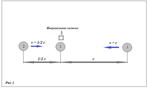 Проведем мысленный эксперимент: возьмем три материальных объекта. Объект номер 1 из условия будет находиться в инерциальной системе отсчёта, и не подвижен. Объект номер 2 будет находиться на расстояние ½ с, и двигаться со скоростью половины скорости света в сторону объекта 1. Объект номер 3 будет находиться на расстоянии с, и двигаться со скоростью света, в направлении материального объекта 1. Рис.1.