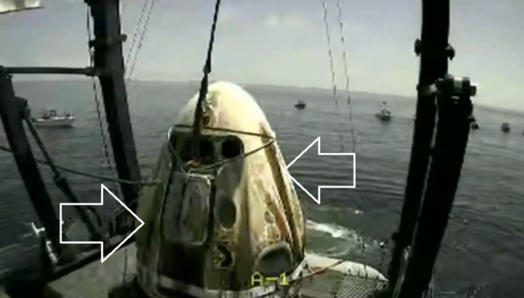 Наконец, в августе 2020 года появилось еще одно подтверждение версии о фальсификации НАСА указанных «полетов». На кадрах видео фильма об этом событии, на фотографиях, сделанных после приводнения, хорошо видно, что боковые поверхности капсулы «Драгон» обгорели полосами даже в районе минимального аэродинамического нагрева. В районе максимального аэродинамического нагрева обгорание и покрытие копотью носит более заметно
