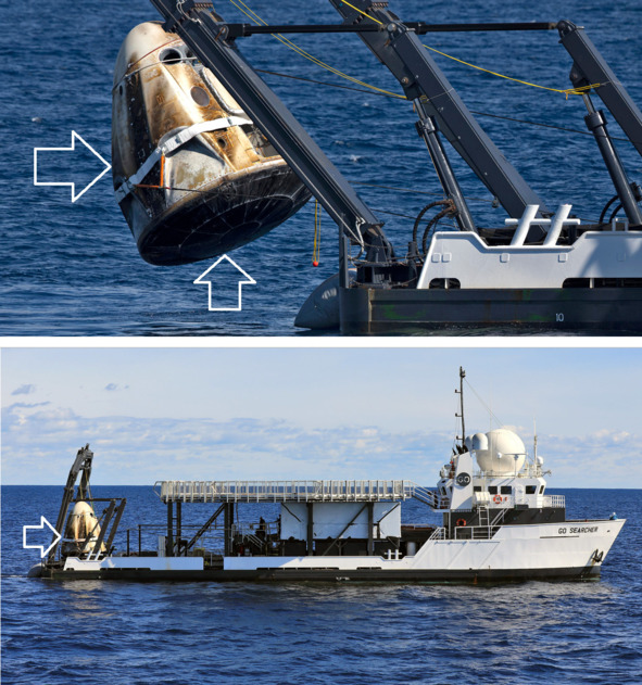 Фотография НАСА, подпись: «S65—33490 (7 июня 1965 г.) – Группа водолазов ВМС США участвует в восстановлении космического корабля Gemini-Titan 4 (GT-4). USS Wasp был основным спасательным кораблем для миссии Gemini-4». На белой полоске, на поверхности аппарата не видно никакой копоти.