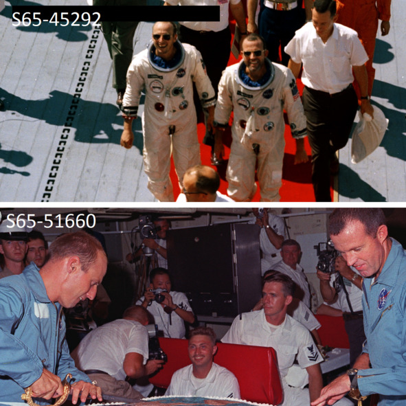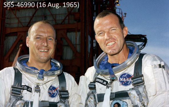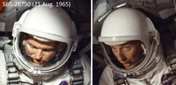 Фотография НАСА, подпись: «S65—46990 (16 августа 1965 г.) Астронавты Чарльз Конрад-младший (слева) и пилот Л. Гордон Купер-младший являются основным экипажем миссии «Gemini-Titan 5». [12] Если верить подписи к этому снимку, то получается, что за 5 дней до начала миссии, загар на лицах «космонавтов» был не таким сильным. Сомнительно, что за указанный период до старта «космонавты» загорали на солнце. Им явно было не до солнечных процедур. Загорать было некогда. В день старта имеется фотография, с датой: 21 августа 1961 года.