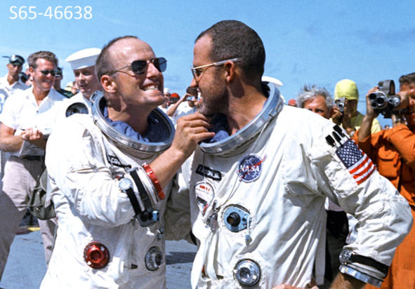 После приводнения, американские «космонавты» излучали бодрость и оптимизм. Хотя они, якобы, провели семь дней в не удобном положении, сидя. Разогнуться у них не было никакой возможности. Естественную нужду они справляли прямо в скафандр, в подгузники и в мешочки. Запах от такого негерметичного приема мочи кала был ужасающим. Атмосфера в капсуле была отравленная. Но «космонавты» улыбаются после такого ужасного испытания, шутят, выселятся!