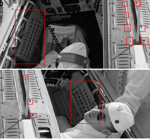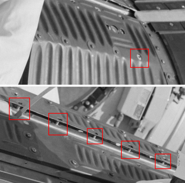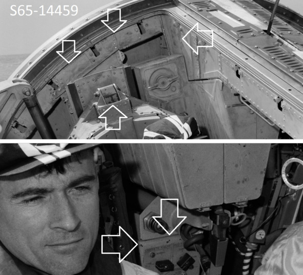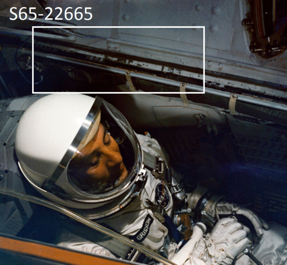 Подпись к фотографии НАСА: «S65—13242 (6 января 1965 г.) – астронавт Джон У. Янг входит в космический корабль Gemini-3 для проверки связи в районе запуска». [3] На кадре наглядно продемонстрирована плохая окраска поверхности внутри кабины. Часть краски осыпалась. На увеличенных фрагментах указанного снимка хорошо видно, что во многих местах верхнего покрытия в виде пластинок, не прикручены винтами. Тоненькие шайбы под головкой винтов не являются гроверами. Это значит, что при вибрации во время реального космического полета такая конструкция рассыплется, как карточный домик. Винты будут вырваны из пластин, из отверстий на металлическом каркасе. Ниже представлены фрагменты снимков НАСА.