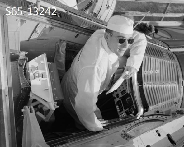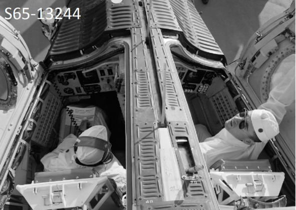 Покраска не единственный признак ужасного качества устройства. Аннотация к увеличенным фрагментам фотографии НАСА: «S65—14459 (24 февраля 1965 г.) – показано, как астронавт Джон У. Янг, пилот основного экипажа „Близнецы-Титан 3“, проводит последнюю проверку систем космического корабля перед тем, как его опустят в воды Мексиканского залива». [5]