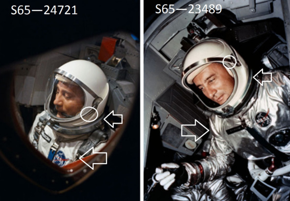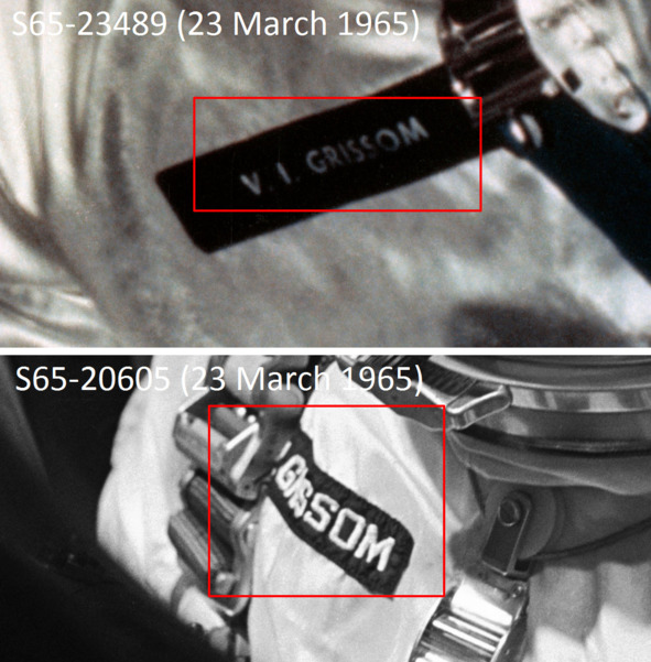 Снимок слева, подпись: «S65—24721 (23 March 1965)». «Космонавт» США на снимке одет в белый костюм. Гермошлем в верхней части не имеет полос. Фотография справа: «S65—23489 (23 March 1965) Астронавт В. Гриссом в КК „Джемини3“ перед запуском». «Космонавт» на этой фотографии одет в серебристый костюм. Гермошлем изменил внешний вид. Если про цвет костюма можно спорить, что это «цветовая температура» изменена, то с шевронами все плохо. Изменение вида шеврона «Гриссом» на первой фотографии, очевидно.