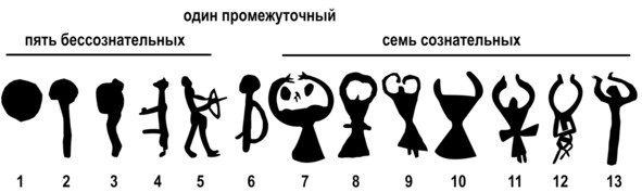 Получилось 13 этапов развития духа. Пять и них полностью бессознательны, один переходный, и семь сознательных. Мне уже была знакома комбинация 5, 1 и 7 из Ленты и Колеса времени. Соотнесение двух систем напрашивалось само.