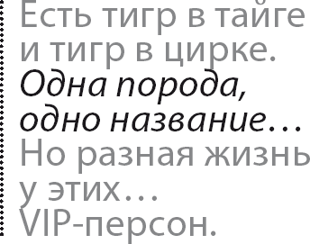 – Так вот… Есть тигр в тайге и тигр в цирке… И тот и другой – могучие, красивые, хищные. Каждому непросто его мясо достается. Одна порода, одно название, одинаковы с виду. Но разная жизнь у этих… VIP-персон.