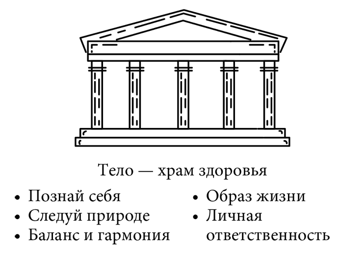 Естественность здоровья – это следование своей природе и природе вещей. Неслучайно на фронтоне древнегреческого храма Аполлона в Дельфах была надпись: «Познай самого себя». Естественность включала гармонию и соразмерность тела и духа, равновесие действующих в организме сил, а еще – гармоничные отношения со средой. Важным считалось следовать своей природе и быть в ладу со всем, что тебя окружает.