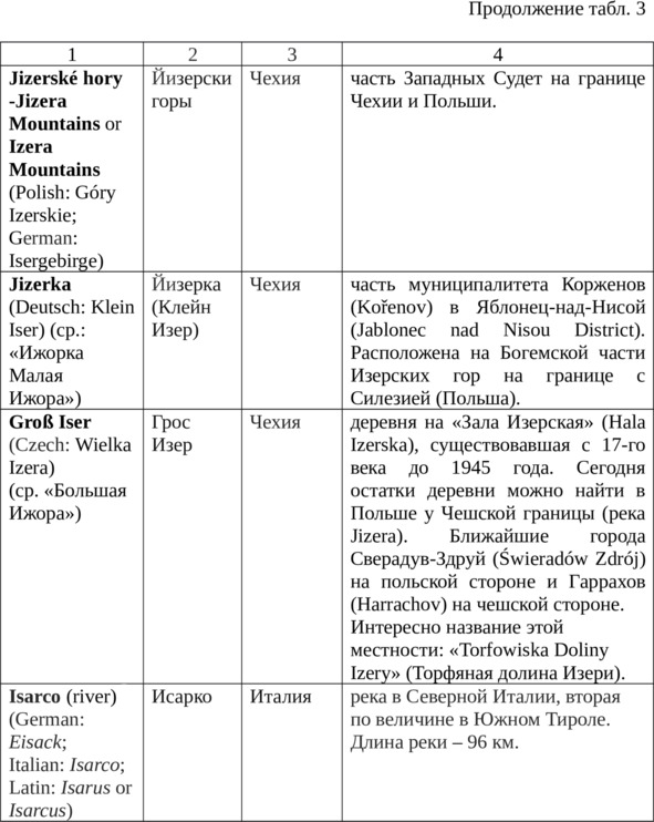 Таблица 3Гидронимы и топонимы на основе кельтского названия железа izer-/jizer- (от протокельт. *isarno «железо») на территории Европы