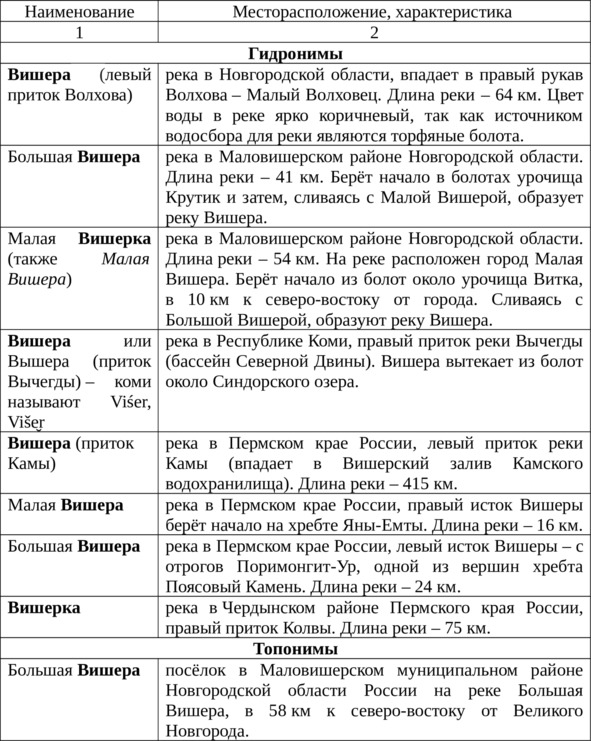 В России существует целый ряд топонимов и гидронимов Вишера (см. табл. 6).