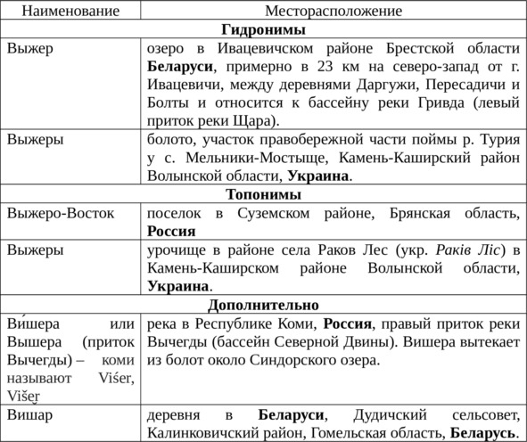 Если наше предположение о существовании слова Выжера верно, то должно существовать слово (топоним или гидроним) «Выжера». И действительно, на территории России, Украины и Беларуси сохранились топонимы и гидронимы с топоосновой выжер- (см. табл. 7).