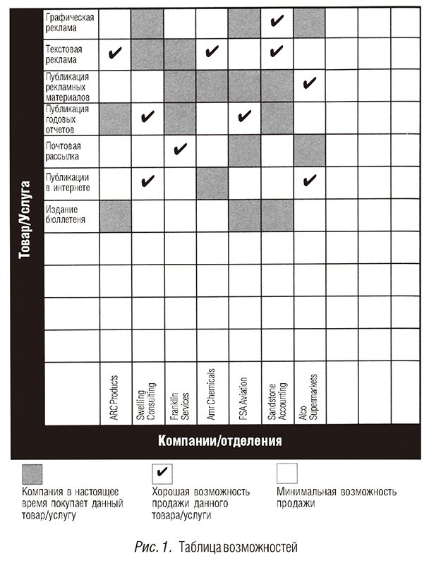 Этот метод работает независимо от вашего опыта в торговле. Если вы новичок в этом деле, таблица возможностей поможет ближе познакомиться с клиентами вашей компании. Более опытных продавцов она подтолкнет к размышлению, как расширить взаимодействие со старыми клиентами, с которыми они работают уже многие годы. «Таблица возможностей» пригодна почти для всех видов бизнеса.