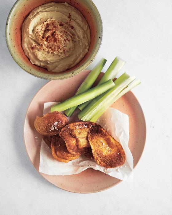 Вероятно, вы гадаете, зачем я вообще готовлю чипсы и хумус дома, ведь в каждом супермаркете найдутся хорошие промышленные аналоги. Все дело во вкусе и качестве! Всякий раз, когда я использовала покупной хумус, мне приходилось пробивать его блендером, пробовать, подсаливать… И я поняла, что с тем же успехом могу делать его дома с нуля. Картофельные чипсы – моя слабость: я предпочитаю горсть чипсов любым сладостям, к тому же мне нравится угощать детей или гостей легкими закусками собственного приготовления, ведь я точно знаю их состав. Если у вас есть терка-мандолина или V‑слайсер, приготовить эти чипсы не составит труда. А они так хороши!