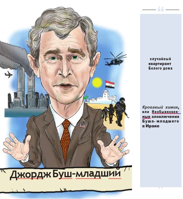 Всемирно известный «потешник»; «Отцы и дети-2» (первые – Джоны Адамсы); яблоко от яблони; «трудный ребёнок» Буша-старшего «на императорском троне»; американские выборы с русским акцентом (фальсификации, судебные разбирательства с пересчётом голосов); «случайный квартирант Белого дома»; поверженные башни (мусульманская пощёчина американской демонократии – 11 сентября 2001 г.); «Кровавый химик, или Необыкновенные злоключения Буша-младшего в Ираке»; месть «Катрины» (самый разрушительный ураган в истории США); Бледнолицый Жорж – Золотые Туфли (после того как на пресс-конференции в Багдаде египетский корреспондент Мунтазар аль-Зейди запустил в Буша-младшего ботинки, саудит Асир Хасан Махафа предложил за них 10 млн долларов); «почётный кризисмэн» (финансовый и ипотечный кризис 2008 г.); «моя твоя не понимай» (вызвал переполох на токийских биржах, заявив о возможной девальвации йены, имея в виду дефляцию); «дорогой» наш президент (войнушки Джорджа обошлись американской казне порядка 5 трл долларов); в тихом омуте черти водятся (бывшая стриптизёрша Тэмми Филлипс утверждала, что у неё был роман с Джорджем Бушем, который закончился в 1999 году. Второй инцидент был связан с изнасилованием Марджи Денис Шёдингер, которая впоследствии покончила жизнь самоубийством); опасная наследственность Билла (в Аммане, Колумбии, Болгарии спецслужбы сообщали о планировании покушений на Буша-младшего); «поцелуй» смерти (10 мая 2005 года, во время выступления Буша на площади Свободы в Тбилиси гражданин Грузии Владимир Арутюнян бросил в сторону сцены гранату. Она не взорвалась по случайности).