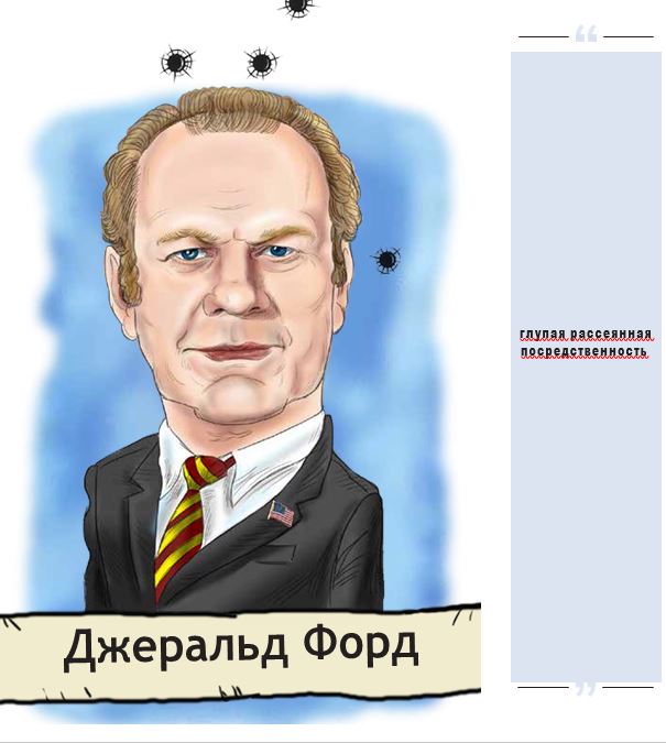 «Незаконнорождённый» президент и вице-президент (был назначен вице-президентом после отставки Спиро Эгнью, а президентом – после отставки Р. Никсона); Пуленепробиваемый Джерри или «рождённый в рубашке» (два покушения без единой царапины. 5 сентября 1975 года в Сакраменто, штат Калифорния, последовательница секты Чарльза Мэнсон Линетт Фромм была схвачена сотрудником секретной службы при попытке выстрела из пистолета. Через семнадцать дней, 22 сентября, в Сан-Франциско Сара Джейн Мур, известная радикальными взглядами, выстрелила в Форда из револьвера и промахнулась); великое противостояние с демократами; «глупая рассеянная посредственность»; «гламурный Джерри» (лик Джеральда украшал обложку журнала «Космополитен»); Неуклюжий Джерри, Хромая Утка (неоднократно падал с трапа самолёта); мальтийский «каменщик» (предшественники: Л. Джонсон, Г. Трумэн, Ф. Рузвельт, У. Гардинг, У. Тафт; Т. Рузвельт, У. Мак-Кинли, Д. Гарфилд, Э. Джонсон; Д. Бьюкенен, Д. Полк, Э. Джексон, Д. Монро, Д. Мэдисон, Д. Вашингтон).