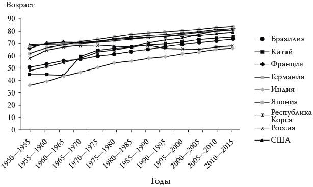 По мере социально-экономического развития в мире ожидаемая продолжительность жизни в отобранных девяти странах заметно возросла с 1950 по 2015 год. В 2015 году этот показатель в Китае достиг 75,25 года, то есть увеличился на 14,66 года (24,19 %). Самая высокая ожидаемая продолжительность жизни зафиксирована в Японии (83,51 года), а самая низкая – в Индии (66,28 года). Китай занимает средние позиции в рейтинге, опережая по этому параметру Бразилию (73,80 года), Индию и Россию (67,46 года) (рис. 1.1). КНР лидирует среди отобранных развивающихся стран, но уступает развитым государствам. Ожидаемая продолжительность жизни населения тесно связана с уровнем социально-экономического развития.