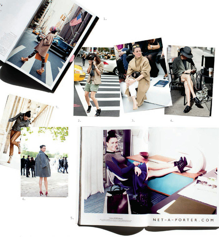 1. Обожаю эту фотографию, снятую Дереком Хендерсоном для австралийского Vogue, – я на ней отчаянная модница. 2. Рабочий день в Нью-Йорке. 3. В первом ряду на показе Chanel. Стараюсь казаться бесстрастной. 4. Центр. Между показами проверяю почту. 5. Снимок Патрика Демаршелье для рекламной кампании Net-à-Porter, помещенный в журнале V. 6. На Неделе моды – здесь я стильная штучка. 7. Когда проходят показы, надеваешь высокие каблуки – чтобы было что показать.