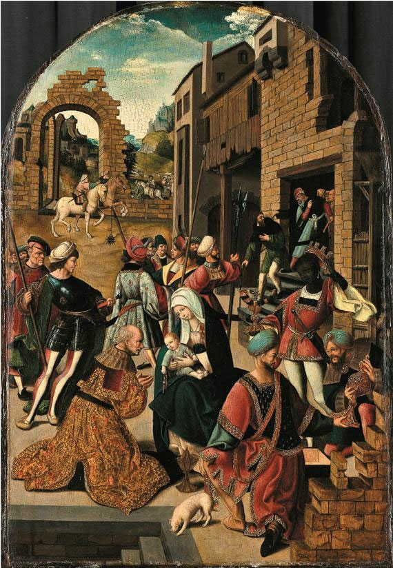 Чернокожие юноши, похожие на слугу третьего волхва, встречаются у Босха на центральной панели «Сада земных наслаждений». Там они напоминают о расовом разнообразии потомков Адама (Wirth 1988. P. 581; Bindman, Gates 2010 II. P. 263–268, Fig. 248–253; Stoichita 2014. P. 45–47).