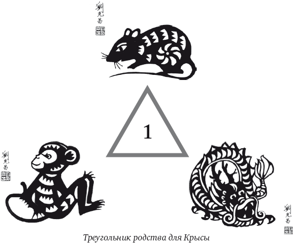 Крыса входит в первый треугольник родства – группу позитивных людей, называемых деятелями. Крыса, Дракон и Обезьяна – это знаки, ориентированные на производительность и прогресс; они отличаются предприимчивостью и новаторством. Это самостоятельные первопроходцы, которые предпочитают инициировать действия, расчищать путь, устраняя неопределенность и колебания, двигаться вперед. Полные динамичной энергии и амбиций, они проявляют беспокойство и вспыльчивость, когда встречают препятствия или вынуждены бездействовать. Это трио – плавильный котел идей. Из них получится хорошая команда: у них много общего в подходе к делам и в способе мышления.