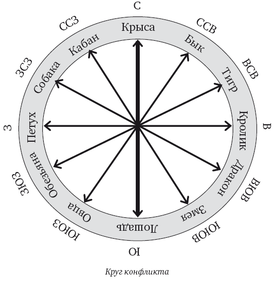Самые серьезные межличностные конфликты ожидают Крысу во взаимоотношениях с людьми знака Лошади – как по году рождения, так и по асценденту. В круге конфликта Крыса и Лошадь разнесены на 180 градусов и, таким образом, представляют собой полные противоположности. Направление Крысы указывает на север, а Лошади – на юг. Крыса олицетворяет зиму, Лошадь – лето. Фиксированный элемент Крысы – вода, а Лошади – огонь.