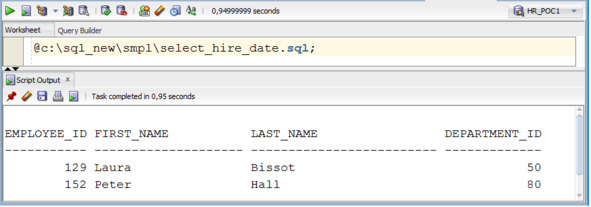 Второй способ. В рабочую область ввести команду, которая начинается с символа @ и содержит путь к файлу, и выполнить эту команду, используя кнопку Run Script. На рисунке 1.19 показан пример применения этого способа выполнения сохраненных операторов SQL.
