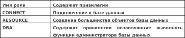 Привилегии могут быть сгруппированы в роли. Роль определяет список привилегий, предоставляемых пользователю. Существуют предопределенные роли, которые администратор может назначить пользователю. Таблица 1.3 содержит список наиболее часто используемых предопределенных ролей.