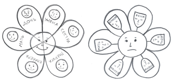 Перед Вами два похожих, но принципиально различающихся «цветка». Сердцевина каждого из них, условно, – личность каждой из женщин, а лепестки – исполняемые ими социальные роли (в реальности ролей гораздо больше). Обратите внимание: у первой женщины лепестки «прорастают» из сердцевины, из её собственного «Я», она «присутствует» в каждой своей роли, проявляет себя; а роли второй женщины «вне её личности», будто приклеенные, она постоянно надевает маски (если внимательно наблюдать за этой женщиной, станет очевидной её неискренность, часто подавляемое раздражение, неудовольствие, страх…).