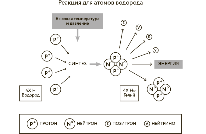 Если же массы достаточно, а давление внутри настолько огромное, что атомы водорода начинают активно сливаться друг с другом, образуя атомы гелия, то загорается звезда. Так, кстати, примерно 4,5 млрд лет назад возникло и наше Солнце. Звезда светит не потому, что внутри нее происходит химическая реакция или реакция ядерного распада – там происходит термоядерный синтез. Через множество превращений четыре ядра атомов водорода соединяются друг с другом. В процессе этого взаимодействия происходит превращение части протонов в нейтроны, выделяется много побочных продуктов и энергия, и получается гелий. Потихоньку звезда исчерпывает энергию, запасенную в той массе водорода, из которой она и состоит. Одним из побочных продуктов этого необычного процесса являются неуловимые частички, названные человеком «нейтрино».