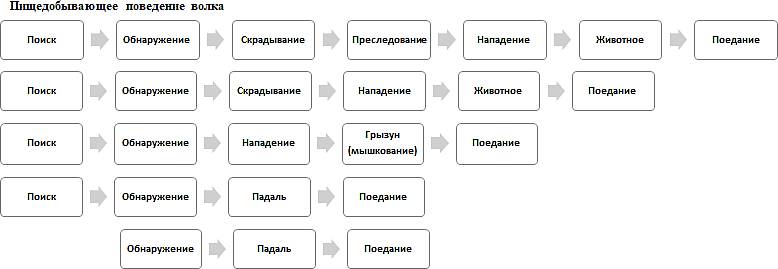 Следует подчеркнуть, что выделяемые элементы – это не столько этапы конкретного (охотничьего) поведения, сколько поведенческие модули, которые используются не только для удовлетворения пищевой потребности.