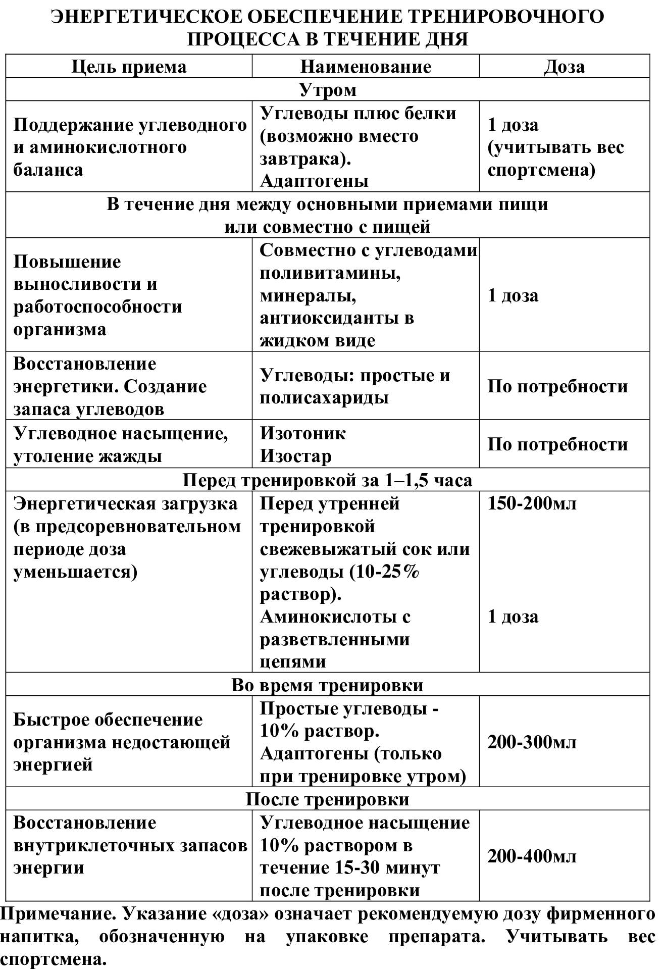 Во время утренней или вечерней тренировки энергетические напитки рекомендуется принимать, если тренировка длится более 90 минут. Также, рекомендуется принимать энергетики в обязательном порядке во время утренней или вечерней тренировки в подростковом возрасте, т. к. это возраст интенсивного роста организма и, при значительных энерготратах, возможно расходование пластического материала (белки, аминокислоты) на обеспечение энергией.