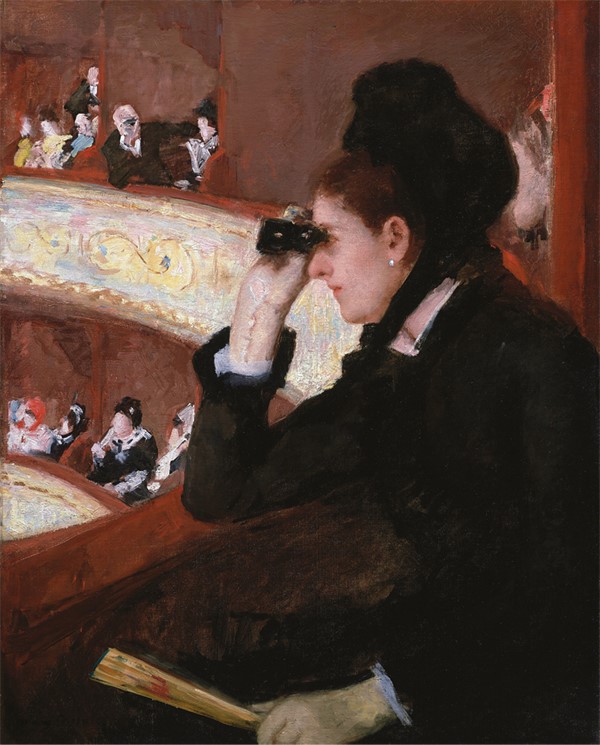Уроженка Филадельфии, Мэри Кэссетт провела три года в Париже, создавая себе репутацию художника, прежде чем Эдгар Дега пригласил ее участвовать в четвертой выставке импрессионистов. Тематика работы «В ложе», изображающей сцену на дневном представлении в театре Комеди Франсез, типична для Кэссетт и основана на ее собственном опыте жизни незамужней женщины в столице Франции. Не обращая внимания на дерзкий, но в то же время бессильный взгляд поклонника вдалеке, независимая театралка Кэссетт уверенно осматривает зрительный зал через театральный бинокль, что делает ее скорее смелым зрителем, чем уязвимым объектом.